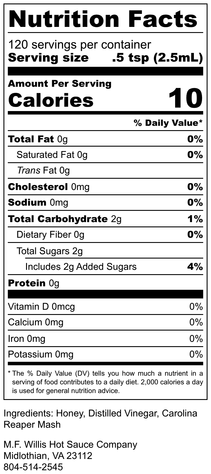 Our hot honey is made with a special blend of honeys, including locally sourced Virginia Honey and infused with garden-grown Carolina Reaper peppers. This pure honey is not only buzz-worthy, but it will add some spice to your life and make your taste buds dance with joy. Plus, we know you can handle the heat (for real, you're one tough cookie).